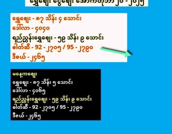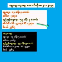 ရွှေစျေး – ၈၇ သိန်း ၄ သောင်းဒေါ်လာ – ၄၀၄၀ရည်ညွှန်းရွှေစျေး – ၅၉ သိန်း ၉ သောင်းဓါတ်ဆီ – 92 – ၂၇၀၅ / 95 –.