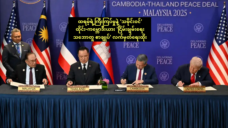 မလေးရှားနိုင်ငံ ကွာလာလမ်ပူ မှာ ကျင်းပနေတဲ့ အာဆီယံ ထိပ်သီး အစည်း အ‌ဝေးကို တက်ရောက်ဖို့ ဒီကနေ့ ရောက်ရှိလာတဲ့ အမေရိကန် သမ္မတ ဒေါ်နယ်ထရမ့် ဟာ ကာလ ကြာရှည် နယ်စပ်ပိုင်ဆိုင်မှု အငြင်းပွားနေတဲ့ ထိုင်းနဲ့ ကမ္ဘောဒီးယား နိုင်ငံတို့ အကြား ချုပ်ဆိုတဲ့ “ငြိမ်းချမ်းရေး သဘောတူစာချုပ်” လက်မှတ်ရေးထိုး ပွဲကို ကြီးကြပ် ပေးခဲ့ပြီး၊ ထရမ့်ကိုယ်တိုင် လက်မှတ်ထိုးကာ “သမိုင်းဝင်” သဘောတူညီချက် လို့ ချီးကျူး ပြောကြားလိုက် ပါတယ်။