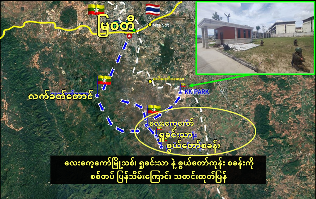 ကရင်ပြည်နယ် ထိုင်းမြန်မာ နယ်စပ် မြဝတီ တောင်ဘက်မှာရှိတဲ့ လေးကေ့ကော်၊ ရှုခင်းသာ နဲ့ စွယ်တော်ကုန်း တို့ကို စစ်တပ်က ပြန်လည် သိမ်းပိုက်ခဲ့ကြောင်း ဒီကနေ့ သတင်းထုတ်ပြန်ထားပါတယ်။