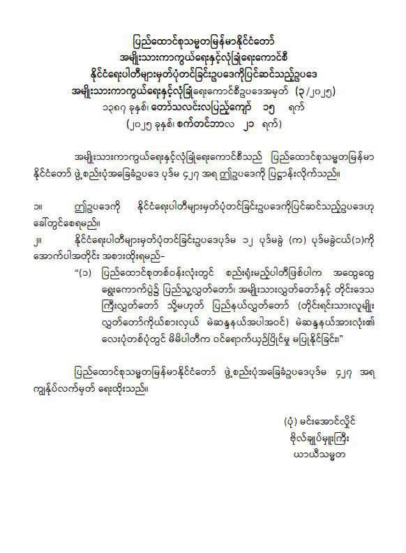 နိုင်ငံရေးပါတီများ မှတ်ပုံတင်ခြင်း ဥပဒေပုဒ်မ ၁၂၊ ပုဒ်မခွဲ (က) ပုဒ်မခွဲငယ် (၁) ကို ပြင်ဆင် ပြဌာန်းလိုက်တာလို့ ဖေါ်ပြထားပြီး ပုံ – မင်းအောင်လှိုင် ဗိုလ်ချုပ်မှူးကြီး ယာယီသမ္မတ ဆိုပြီး လက်မှတ်ရေးထိုး ထုတ်ပြန်တာ ဖြစ်ပါတယ်။