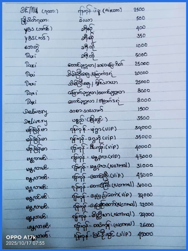 ရန်ကုန်မြို့တွင်း နဲ့ ခရီးဝေးတချို့ အတွက် ခရီးသွားလာစရိတ် နှုန်းထားများ (အောက်တိုဘာ ၁၇ – ၂၀၂၅)
