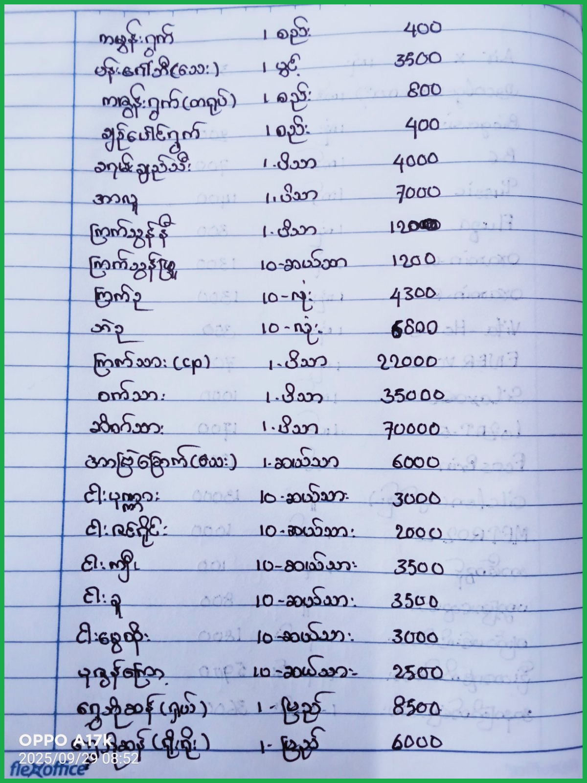 ရန်ကုန် ရပ်ကွက်စျေးတခုက လက်လီ ကုန်စျေးနှုန်းများ (စက်တင်ဘာ ၂၉ – ၂၀၂၅)