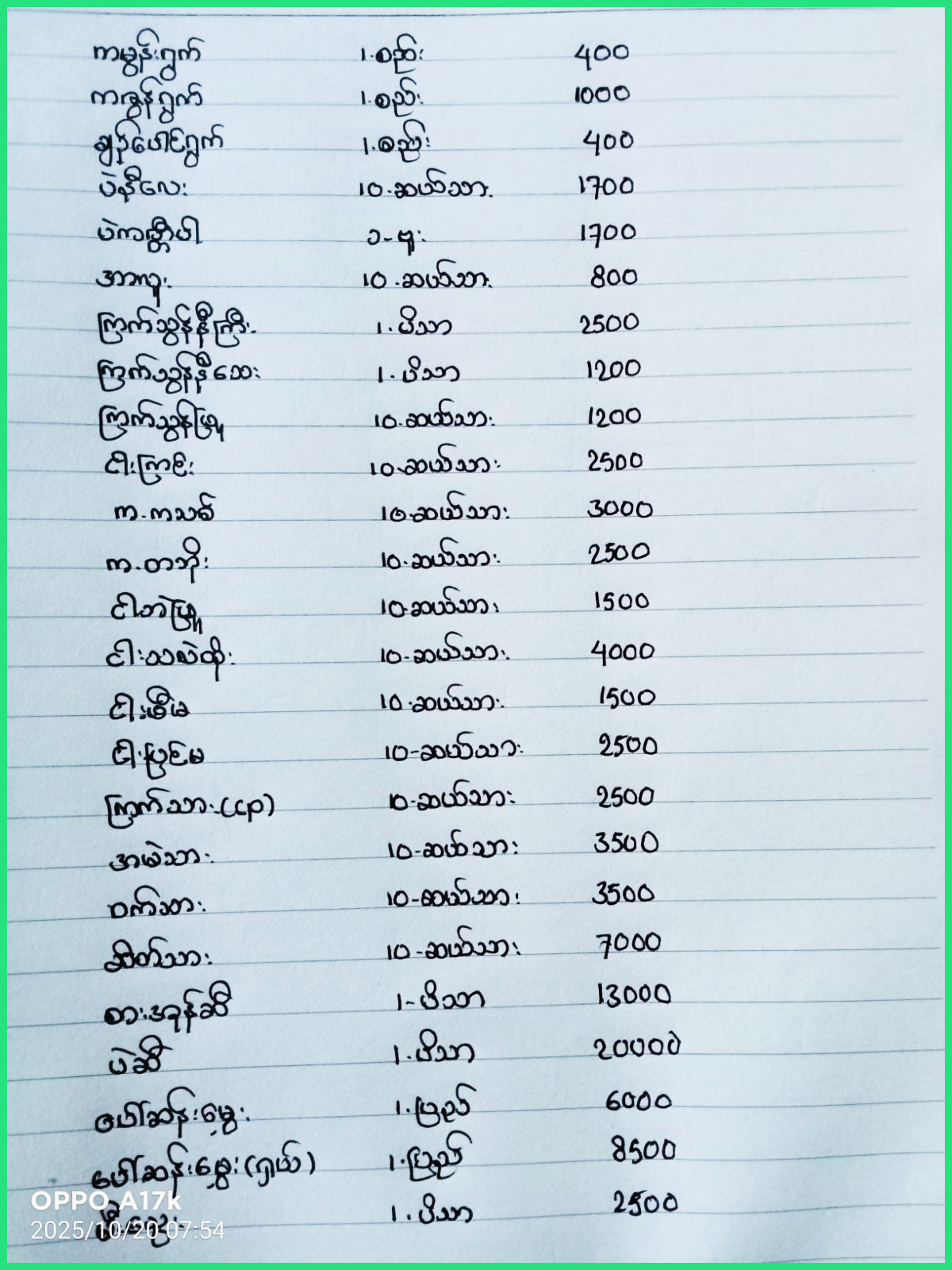 ရန်ကုန် ရပ်ကွက်စျေး တခုက နေ့စဥ် လက်လီ ကုန်စျေးနှုန်းများ (အောက်တိုဘာ ၂၀ – ၂၀၂၅)