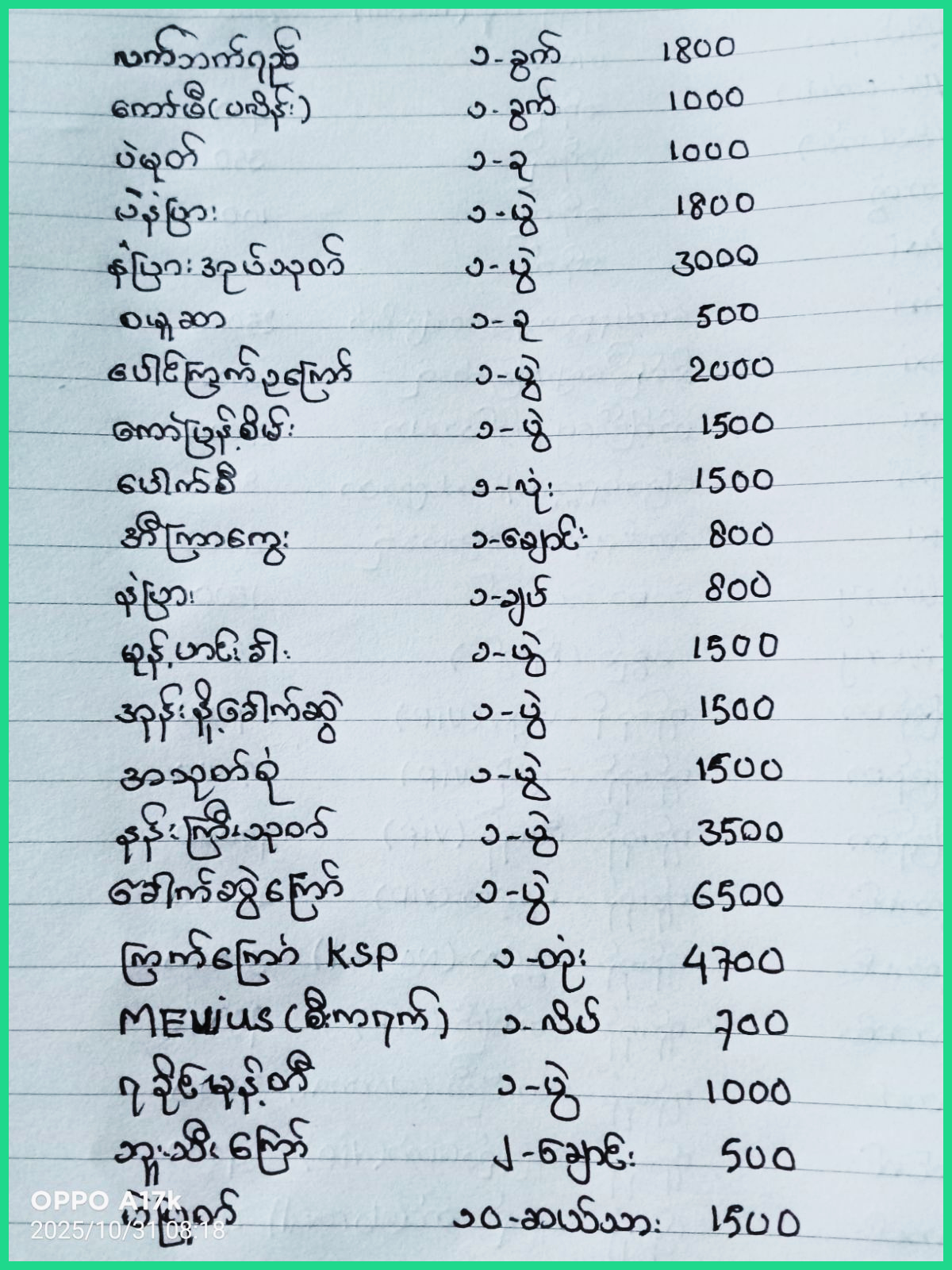 ရန်ကုန် ရပ်ကွက် လက်ဘက်ရည်ဆိုင် တဆိုင်က စားဖွယ် စျေးနှုန်းများ (အောက်တိုဘာ ၃၁ – ၂၀၂၅)