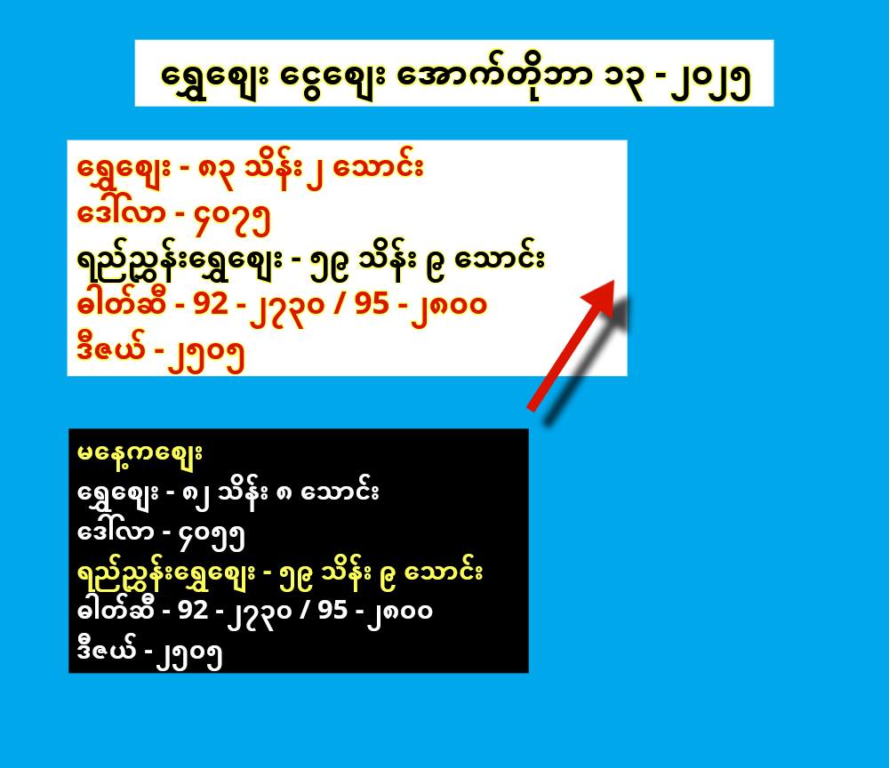 ဓါတ်ဆီ – 92 – ၂၇၃၀ / 95 – ၂၈၀၀