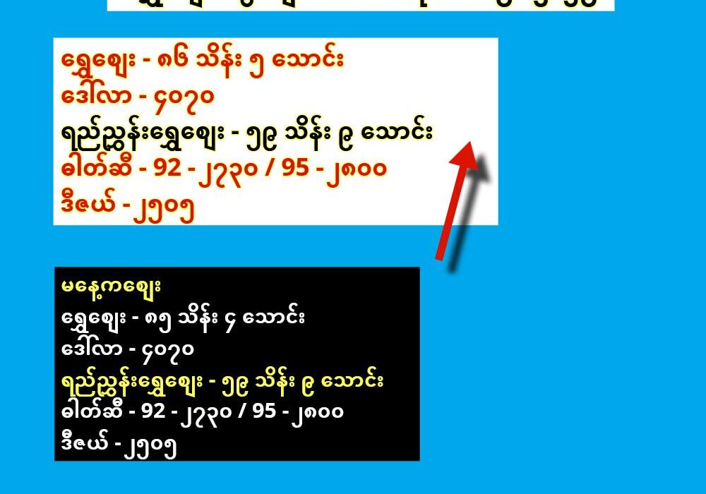 ဓါတ်ဆီ – 92 – ၂၇၃၀ / 95 – ၂၈၀၀