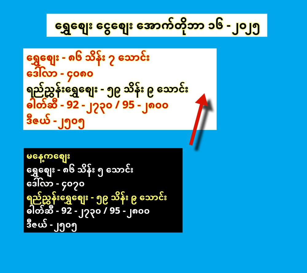 ဓါတ်ဆီ – 92 – ၂၇၃၀ / 95 – ၂၈၀၀