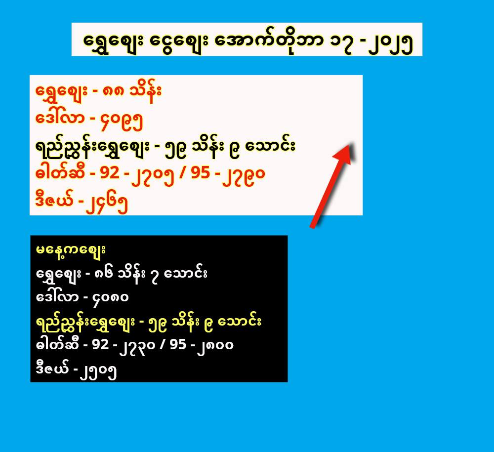 ဓါတ်ဆီ – 92 – ၂၇၃၀ / 95 – ၂၈၀၀