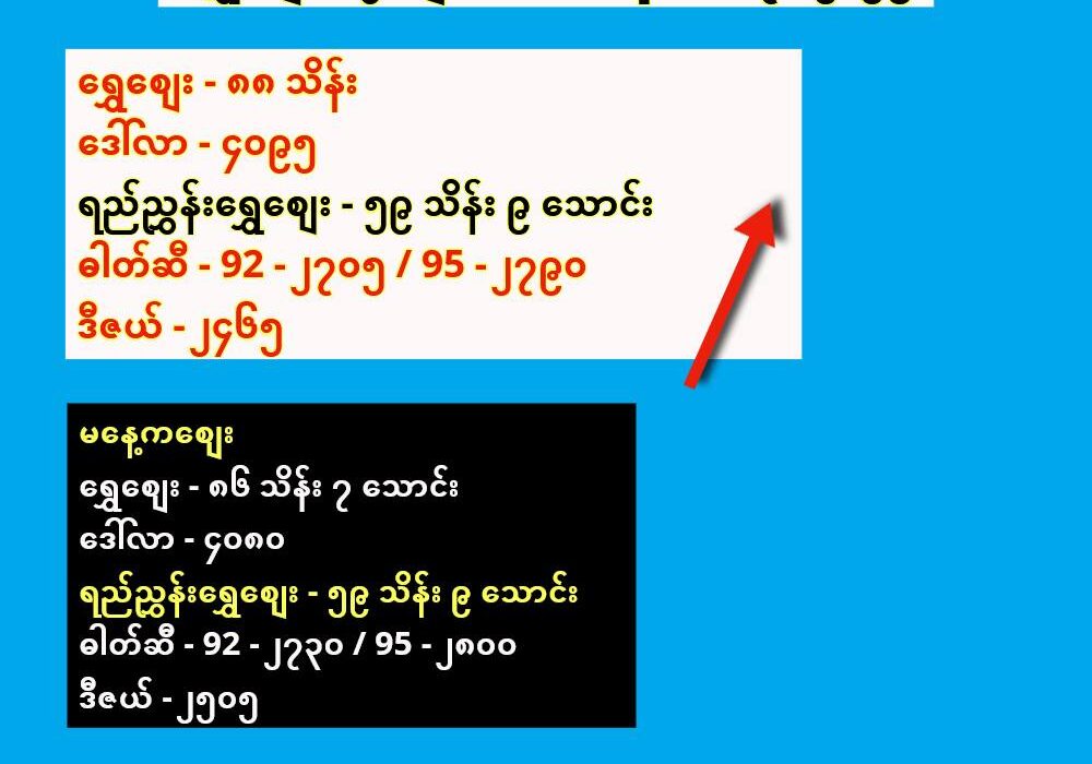 ဓါတ်ဆီ – 92 – ၂၇၃၀ / 95 – ၂၈၀၀