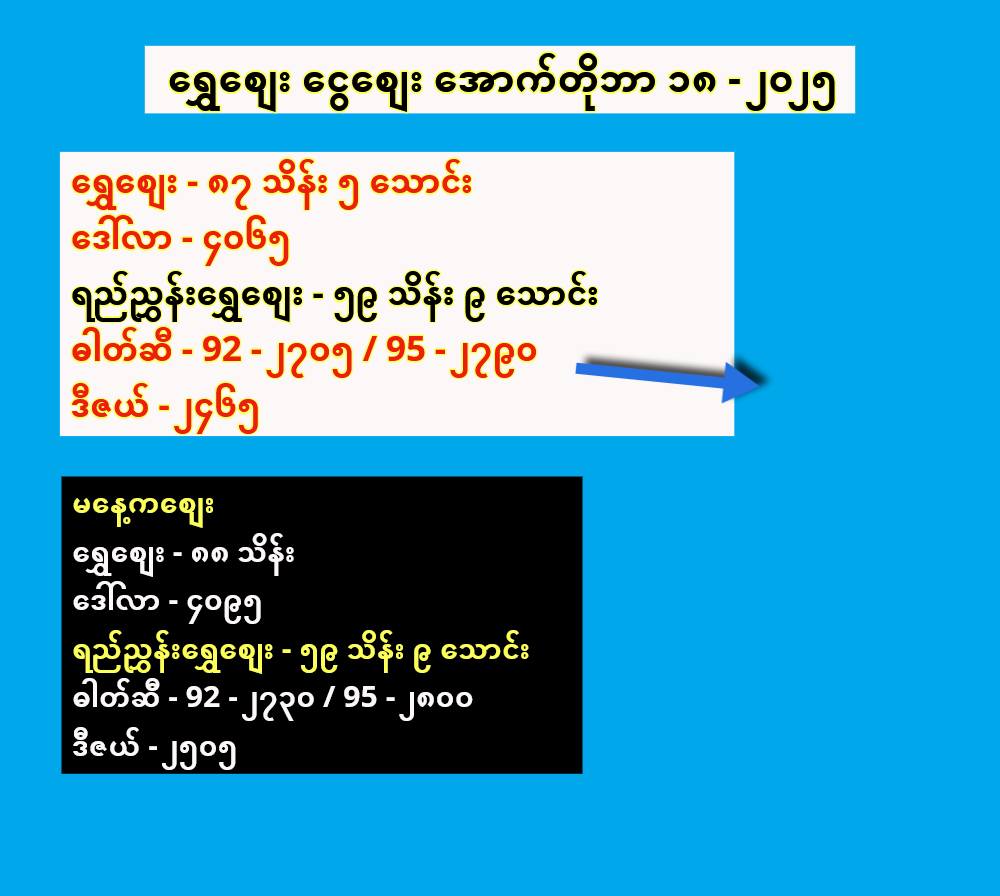 ဓါတ်ဆီ – 92 – ၂၇၃၀ / 95 – ၂၈၀၀