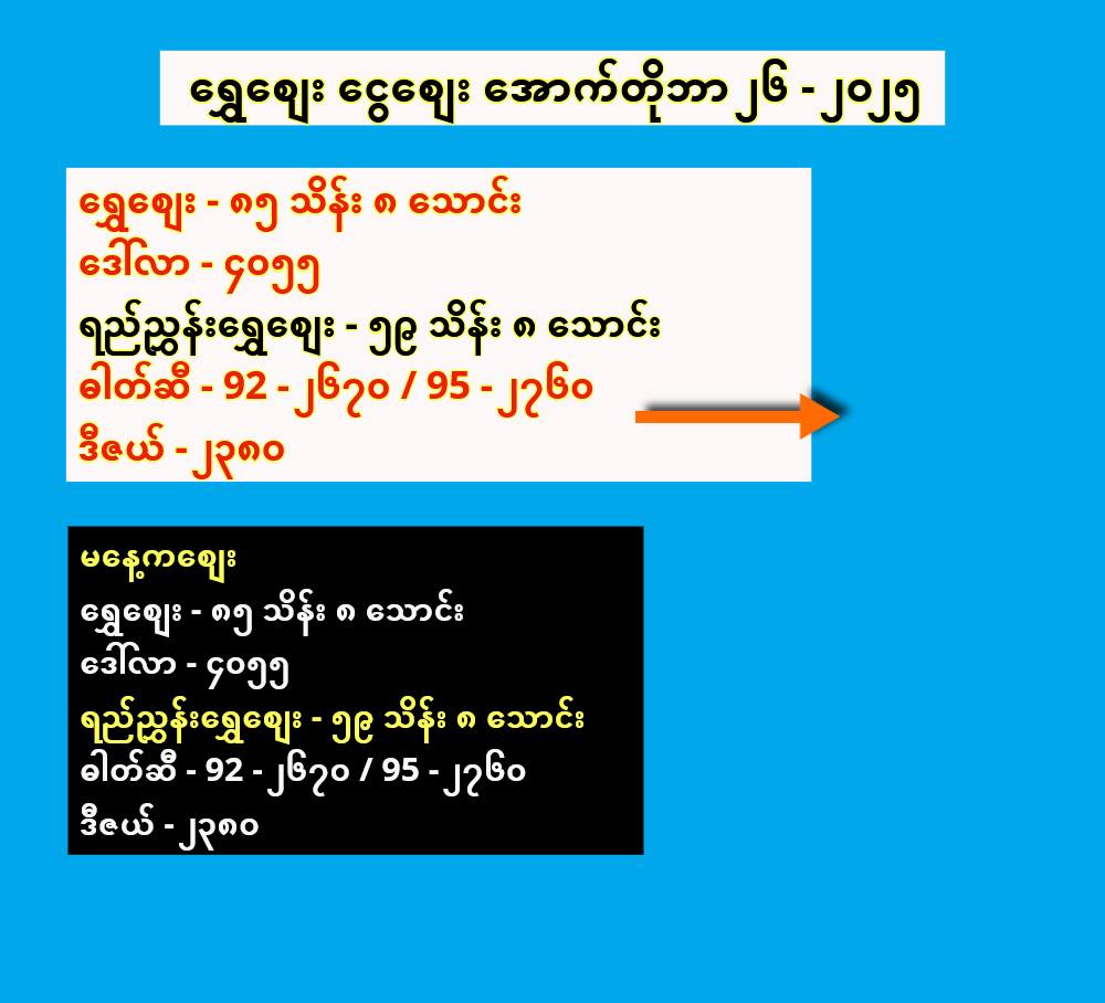 ဓါတ်ဆီ – 92 – ၂၆၇၀ / 95 – ၂၇၆၀