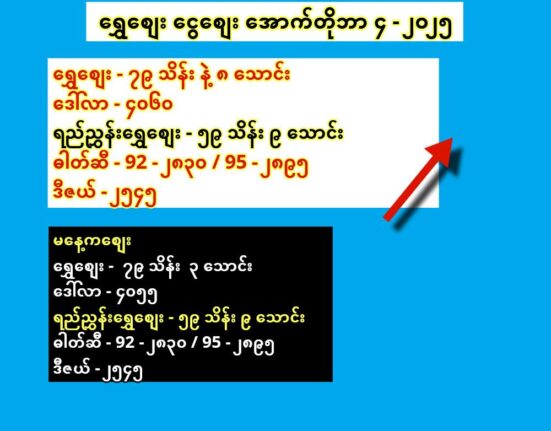 ရွှေစျေး – ၇၉ သိန်း နဲ့ ၈ သောင်းဒေါ်လာ – ၄၀၆၀ရည်ညွှန်းရွှေစျေး – ၅၉ သိန်း ၉ သောင်းဓါတ်ဆီ – 92 – ၂၈၃၀ / 95 – ၂၈၉၅ဒီဇယ် –
