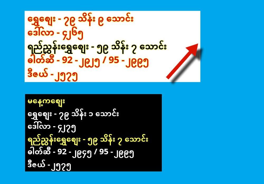 ရွှေစျေး ငွေစျေး စက်တင်ဘာ ၁၆ – ၂၀၂၅ ရွှေစျေး – ၇၉ သိန်း ၉ သောင်း ဒေါ်လာ – ၄၂၆၅ ရည်ညွှန်းရွှေစျေး – ၅၉ သိန်း ၇ သောင်း ဓါတ်ဆီ – 92 – ၂၉၂၅ / 95 – ၂၉၉၅ ဒီဇယ် – ၂၅၇၅ —————– မနေ့ကစျေး ရွှေစျေး – ၇၉ သိန်း ၁ သောင်း ဒေါ်လာ – ၄၂၇၅ ရည်ညွှန်းရွှေစျေး – ၅၉ သိန်း ၇ သောင်း ဓါတ်ဆီ – 92 – ၂၉၄၅