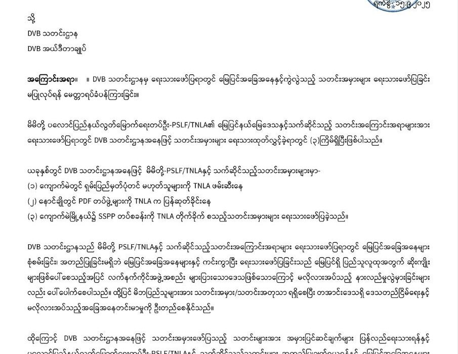 PSLF/TNLA တအာင်းအဖွဲ့ နဲ့ ပတ်သက်ပြီး သတင်းအမှားတွေ မဖေါ်ပြဖို့ DVB ကို စာပို့