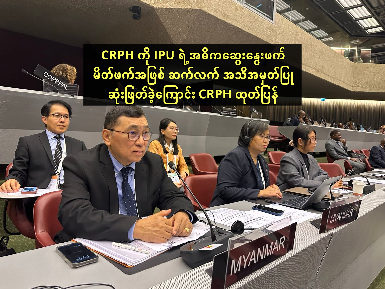 ဆွစ်ဇာလန် နိုင်ငံ ဂျနီဗာမြို့မှာ ကျင်းပနေတဲ့ (၁၅၁) ကြိမ်မြောက် နိုင်ငံတကာပါလီမန်များ ညီလာခံ IPU အမှုဆောင်ကောင်စီ အစည်းအဝေး ကနေ ဒီကနေ့မှာ ပြည်ထောင်စုလွှတ်တော်ကိုယ်စားပြုကော်မတီ (CRPH) ကို IPU ရဲ့ အဓိက ဆွေးနွေးဖက် မိတ်ဖက် အဖြစ် ဆက်လက် အသိအမှတ် ပြု ဆုံးဖြတ်ခဲ့ကြောင်း CRPH က သတင်းထုတ်ပြန်ထားပါတယ်။