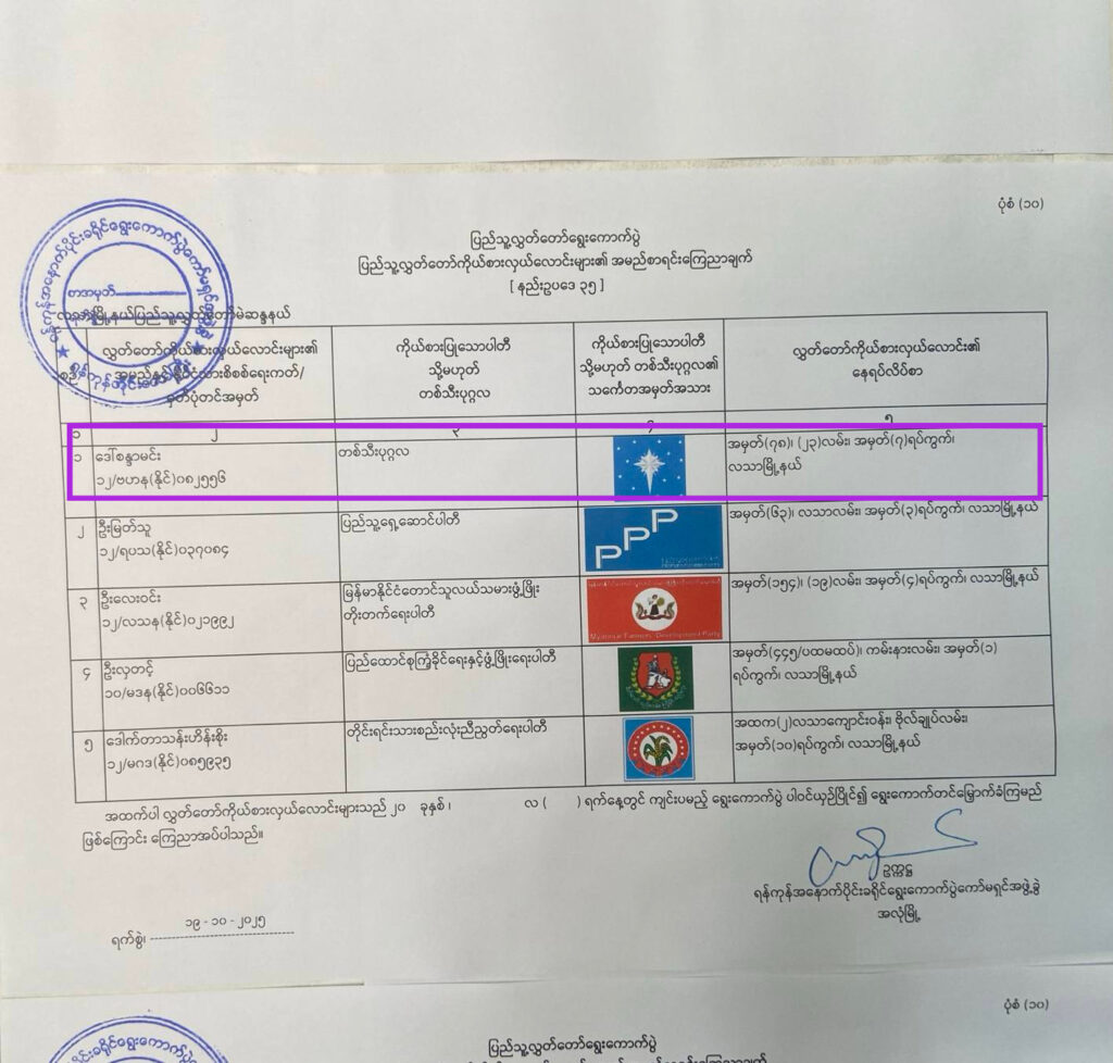 UEC ကနေ ဒီဇင်ဘာ ရွေးကောက်ပွဲမှာ ဝင်ရောက်ယှဥ်ပြိုင်ကြဖို့ စားရင်တင်သွင်းထားတဲ့ လွှတ်တော် ကိုယ်စားလှယ် လောင်းတွေ ထဲက စိစစ်လက်ခံ အတည်ပြုထားတဲ့ ကိုယ်စားလှယ်လောင်း စာရင်းတွေကို ကို ဒီကနေ့မှာ သက်ဆိုင်ရာ ကော်မရှင်ရုံးခွဲတွေမှာ ကပ်ထားပေးပြီ ဖြစ်တယ်လို့ ကြေညာချက် ထုတ်ပြန်ထားပါတယ်။