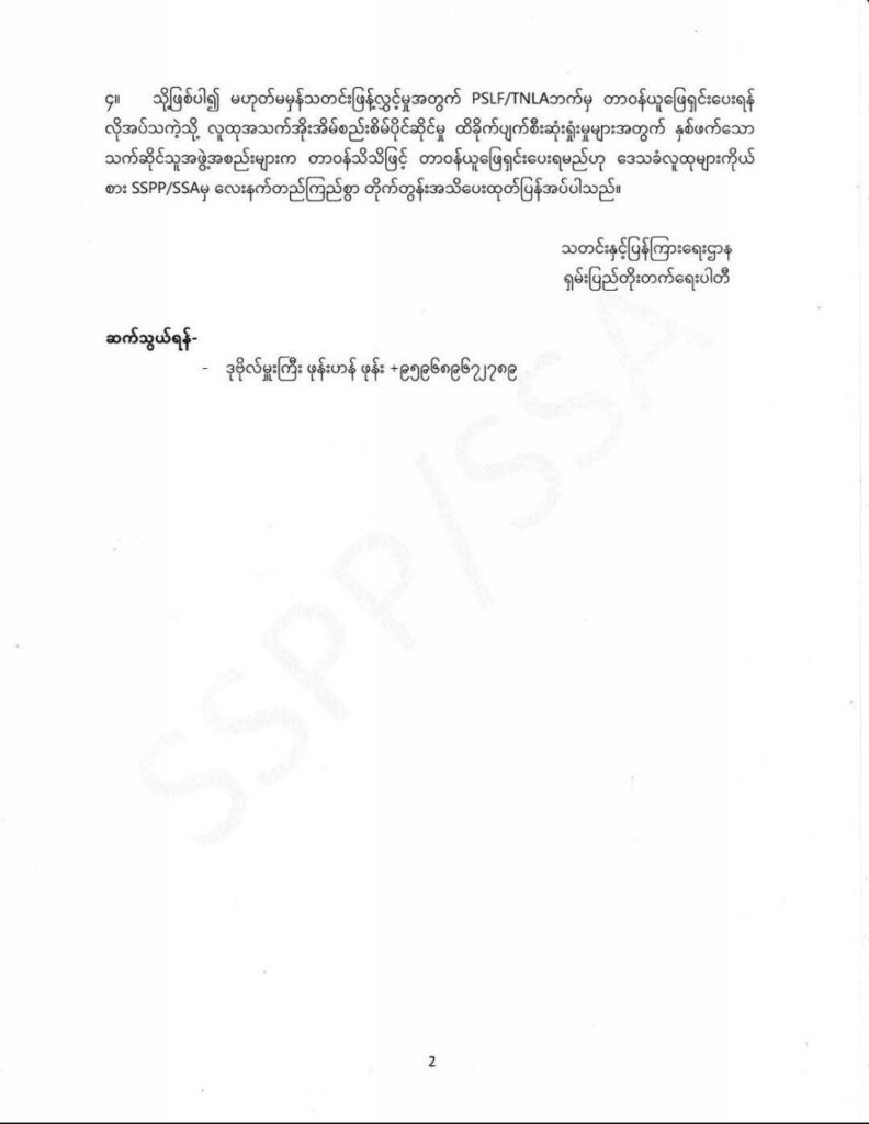 ရှမ်းမြောက်ဒေသမှာ ၁၀၂၇ စစ်ဆင်ရေးအတွင်း TNLA တအာင်းတပ်ဖွဲ့ က ထိန်းချုပ်ခဲ့တဲ့ ကျောက်မဲ နဲ့ သီပေါ မြို့တွေကို မကြာသေးခင်က စစ်တပ် ကနေ ပြန်လည် ထိုးစစ်ဆင် ထိန်းချုပ်သွားတဲ့ အပေါ် ဒါဟာ ရှမ်းပြည်တိုးတက်ရေးပါတီ SSPP က ကူညီပေးတာ လမ်းကြောင်းဖွင့်ပေး တာကြောင့် လက်လွှတ်လိုက်ရတာလို့ TNLA ပြောခွင့်ရသူရဲ့ ပြောဆိုမှုတွေ ကို SSPP က အပြင်း အထန် ကန့်ကွက်ကြောင်းနဲ့ တာဝန်ယူဖြေရှင်ပေးဖို့ ဒီကနေ့ ကြေညာချက်ထုတ်ပြန်လိုက်ပါတယ်။