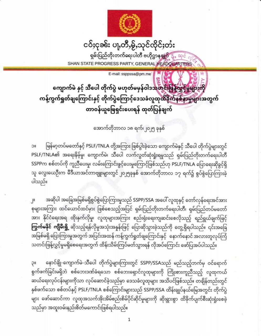 ရှမ်းမြောက်ဒေသမှာ ၁၀၂၇ စစ်ဆင်ရေးအတွင်း TNLA တအာင်းတပ်ဖွဲ့ က ထိန်းချုပ်ခဲ့တဲ့ ကျောက်မဲ နဲ့ သီပေါ မြို့တွေကို မကြာသေးခင်က စစ်တပ် ကနေ ပြန်လည် ထိုးစစ်ဆင် ထိန်းချုပ်သွားတဲ့ အပေါ် ဒါဟာ ရှမ်းပြည်တိုးတက်ရေးပါတီ SSPP က ကူညီပေးတာ လမ်းကြောင်းဖွင့်ပေး တာကြောင့် လက်လွှတ်လိုက်ရတာလို့ TNLA ပြောခွင့်ရသူရဲ့ ပြောဆိုမှုတွေ ကို SSPP က အပြင်း အထန် ကန့်ကွက်ကြောင်းနဲ့ တာဝန်ယူဖြေရှင်ပေးဖို့ ဒီကနေ့ ကြေညာချက်ထုတ်ပြန်လိုက်ပါတယ်။