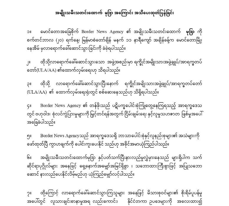 စက်တင်ဘာ ၂၃ – ၂၀၂၅ Border News Agency ရဲ့ သတင်းထောက် အမျိုးသမီး မမုဒြာကို စက်တင်ဘာလ ၂၀ ရက်နေ့၊ မြန်မာစံတော်ချိန် မနက် ၁၁ နာရီကျော် အချိန်လောက်မှာ မောင်တောမြို့ နေအိမ်ကနေ ULA/AA က လာရောက် ခေါ်ဆောင်သွားကြောင်း မနေ့ စတင်ဘာ ၂၂ ရက်နေ့မှာ Border News Agency ကနေ သတင်းထုတ်ပြန် ထားပါတယ်။ မမုဒြာ နဲ့ ပတ်သက်ပြီး နားလည်မှုလွှဲမှားနေတာတွေ ရှိမယ်ဆိုရင် သက်ဆိုင် ရာပုဂ္ဂိုလ်တွေ အနေနဲ့ ရှေ့နောက် အမျှော်အမြင် ရှိစွာ၊ သဘောထားကြီးစွာနဲ့ အပြုသဘောဆောင် နားလည်ပေးနိုင်လိမ့်မယ်လို့ ယုံကြည်မျှော်လင့်ကြောင်းလည်း ဖေါ်ပြထားပါတယ်။ မိသားစုဝင်တွေရဲ့ စိုးရိမ်ပူပန်မှု အပေါ် တွင်