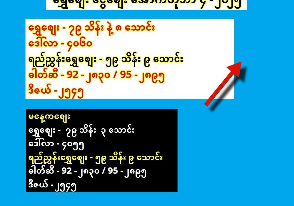 ရွှေစျေး – ၈၂ သိန်း ၈ သောင်း ဒေါ်လာ – ၄၀၅၅ ရည်ညွှန်းရွှေစျေး – ၅၉ သိန်း ၉ သောင်း ဓါတ်ဆီ – 92 – ၂၇၃၀ / 95 – ၂၈၀၀ ဒီဇယ် – ၂၅၀၅ ———— မနေ့ကစျေး ရွှေစျေး – ၈၂ သိန်း ဒေါ်လာ – ၄၀၆၀ ရည်ညွှန်းရွှေစျေး – ၅၉ သိန်း ၉ သောင်း ဓါတ်ဆီ – 92 – ၂၈၃၀ / 95 – ၂၈၉၅ ဒီဇယ် – ၂၅၄၅